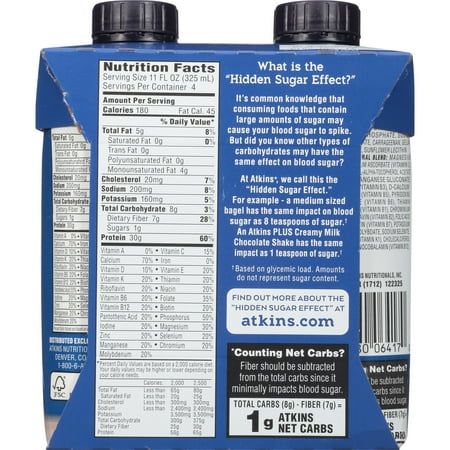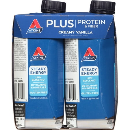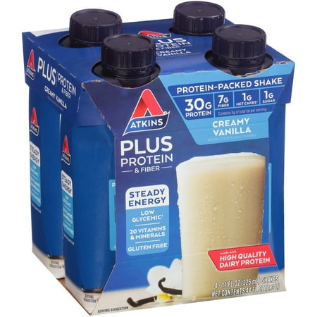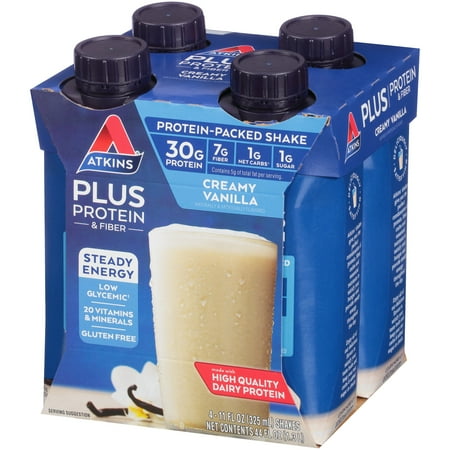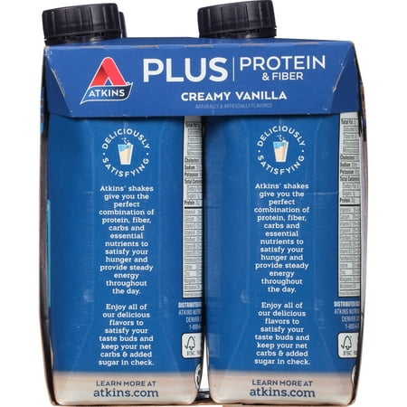 Atkins PLUS Protein and Fiber Cream Vanilla Milkshake, 11 fl oz, 4 packs (ready to drink)