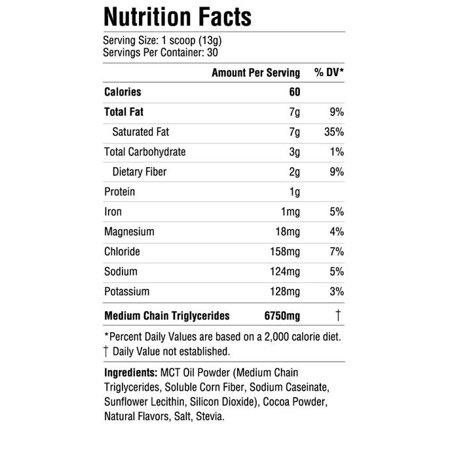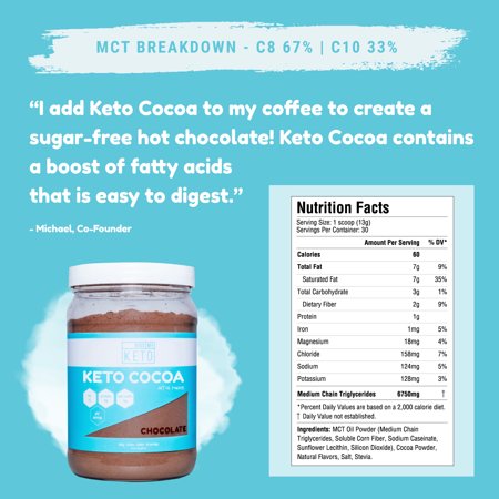 - KETO COCOA. Sugar free hot chocolate. Each service contains a net carbon and 6.75 grams of medium chain TRIGLYCERIDES. The MCT oil is 67% C8 caprylic acid. No C12 lauric acid. Contains no sugar or fillers such as maltodextrin, corn starch or other chemicals and additives.